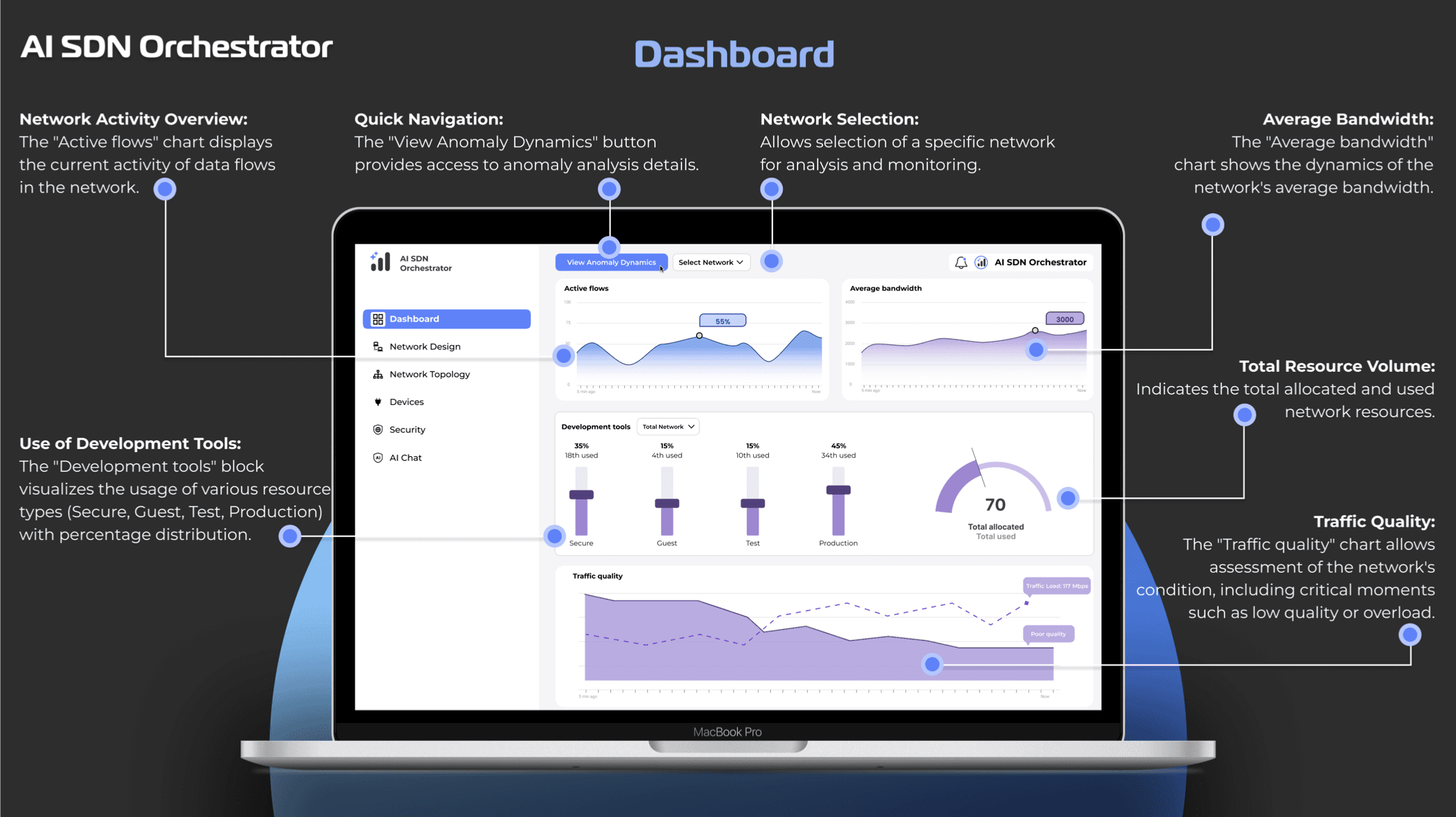 AI processes network, traffic, and device status data, providing instant recommendations and forecasts.